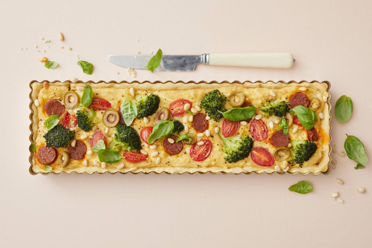 - Levitä päälle parsakaalit, viipaloidut vegaanimakkarat, puolitetut miniluumutomaatit ja oliivit.
