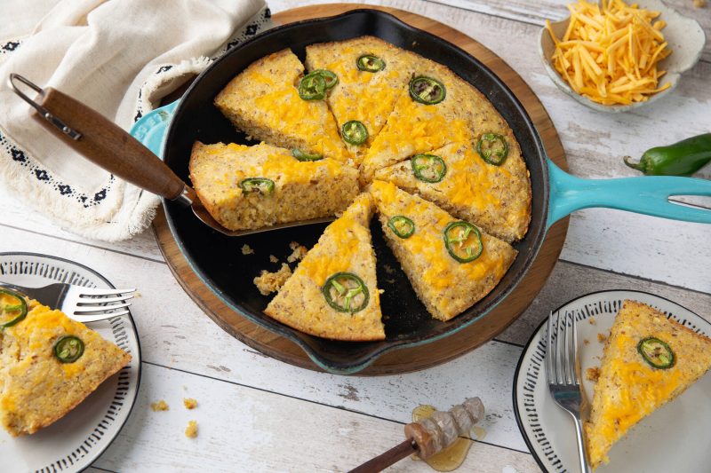 - Lisää joukkoon Veggie-raaste ja hienonnettu jalapeno (tee muutama viipale pinnalle). Säästä hiukan pinnalle koristeeksi. Anna taikinan levätä 10 min.