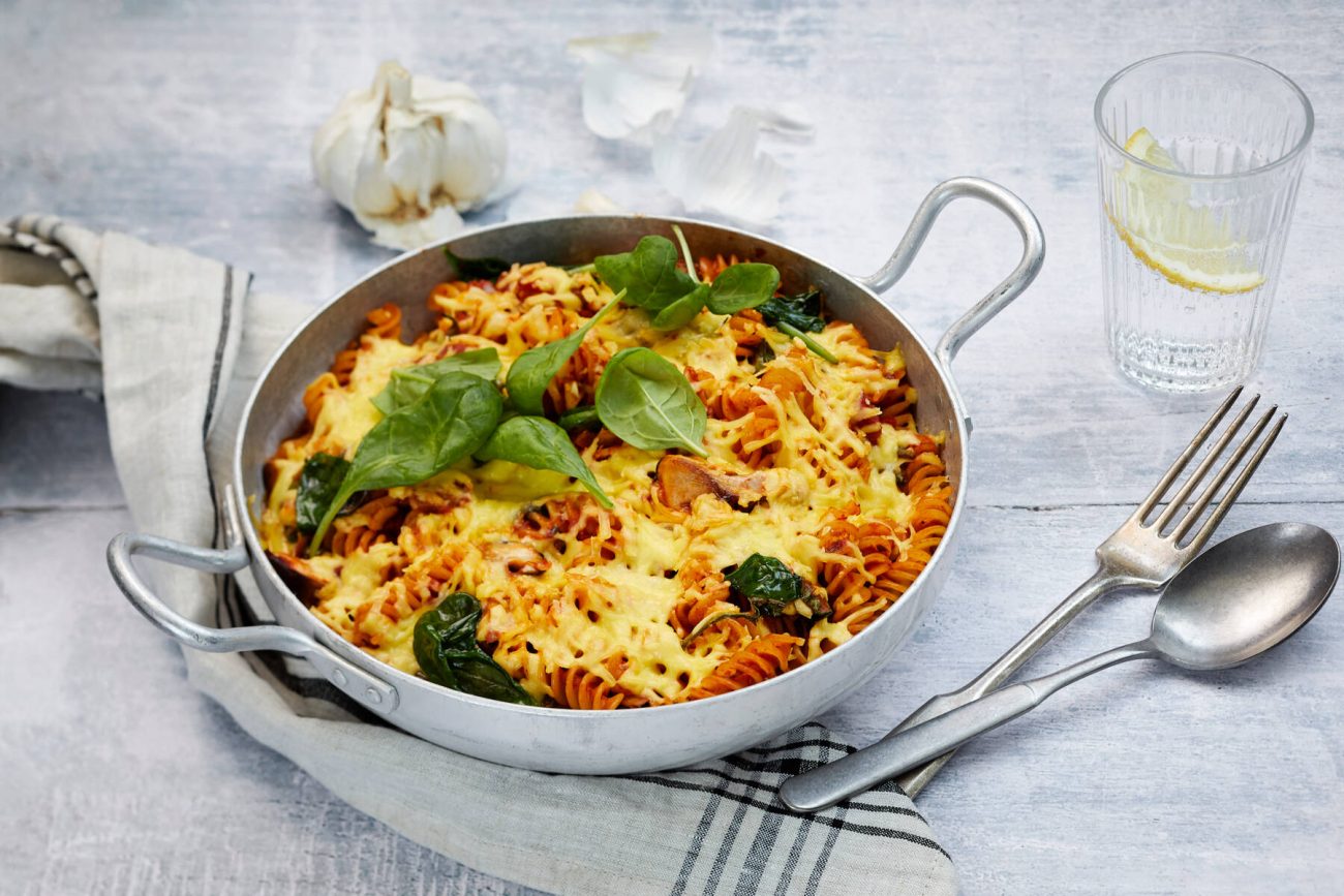 - Sekoita kaikki ainekset uunivuoassa, ripottele päälle raaste.