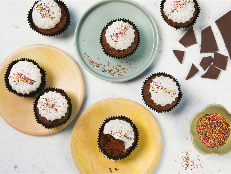 - Vaahdota Easy Whipping sekä suklaa-pähkinälevite keskenään sähkövatkaimella kuohkeaksi vaahdoksi. Mausta vaniljasokerilla. Pursota jäähtyneiden muffinsien päälle. Koristele stösseleillä.