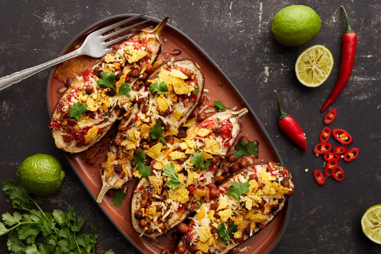 - Paista valutetut kikherneet pannulla öljyssä rapsakoiksi. Mausta. Lisää mausteset kikherneet munakoisojen päälle. Ripottele lopuksi pinnalle Veggie raaste sekä murskattuja nachoja.