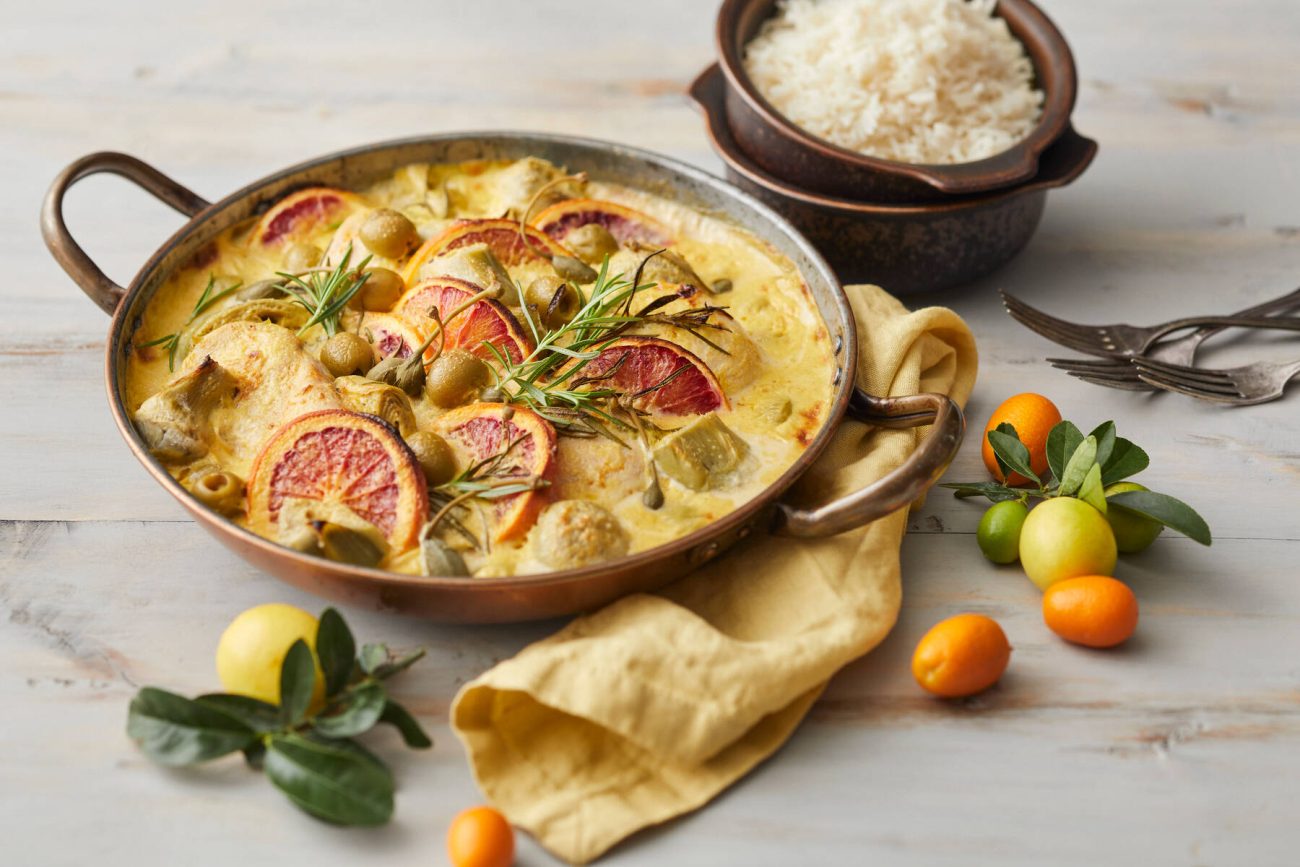- Asettele broilerifileet lomittain vuokaan, täyttäen välit rosmariinioksilla ja veriappelsiiniviipaleilla. Levitä päälle ja vuokaan artisokat ja oliivit.