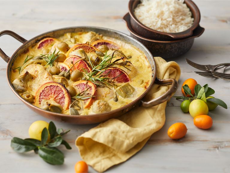 - Asettele broilerifileet lomittain vuokaan, täyttäen välit rosmariinioksilla ja veriappelsiiniviipaleilla. Levitä päälle ja vuokaan artisokat ja oliivit.