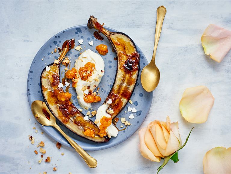 - Asettele banaanit annoslautaselle. Lusikoi viereen rahkaa, kermavaahtoa ja lakkoja.