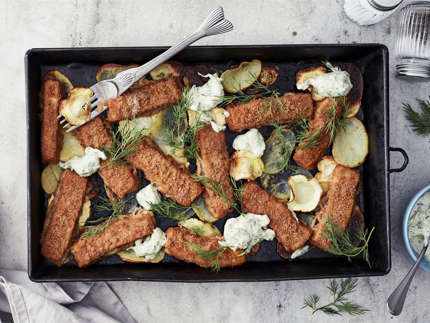 Kalapuikkoja, rapeiksi sipseiksi uunissa paistuvia juureksia ja kylkeen raikas kurkkudippi. No nam! Tämä tallennetaan arjen luottoresepteihin.