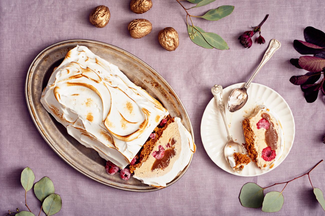 Jouluhalkoa muistuttava Baked Alaska sekä piparijäädyke ovat täydellisiä vaihtoehtoja juhlavampaan kattaukseen. Marjaisa valkosuklaajäätelö ja piparitaikinajäätelö ovat sen sijaan taatusti kaikkien makuun.