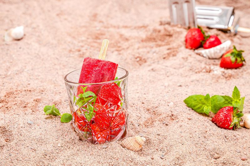 Tämä drinkki pysyy viileänä mustikkamehusta, roseeviinistä ja sokeriliemestä valmistettujen mehujäiden voimalla. Mehujää mansikoiden kera lasiin ja päälle loraus roseeta.