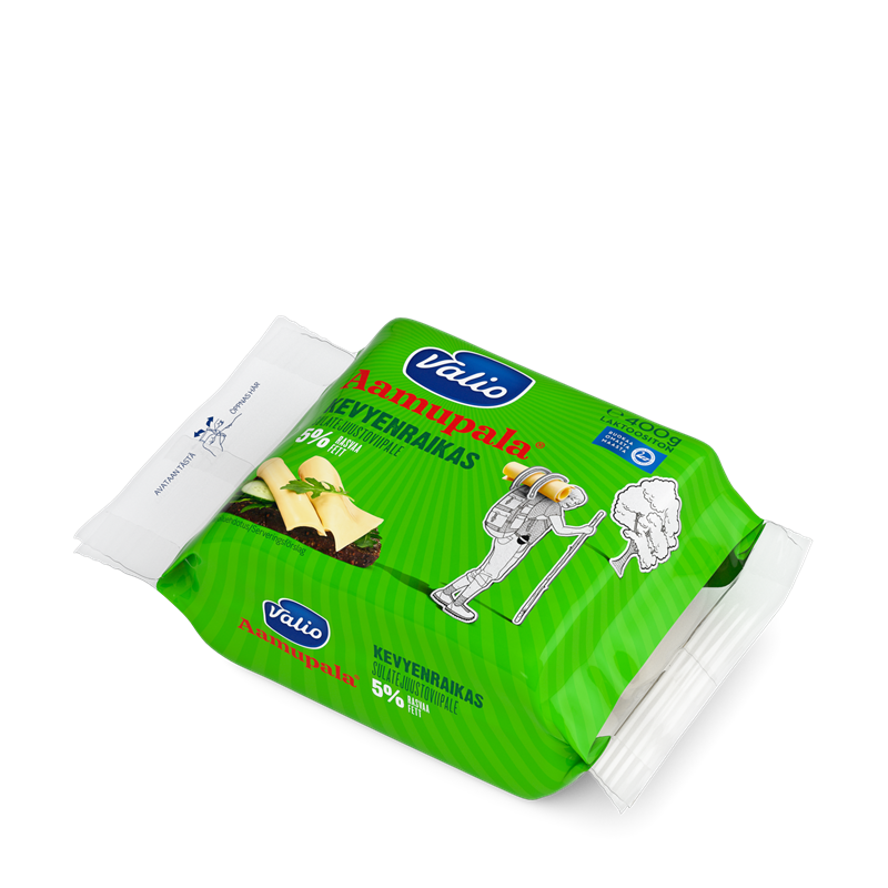 Valio Aamupala® on aurinkoinen ja helppo tapa tehdä voileipä! Nämä suosikkisulatejuustoviipaleet ovat maistuneet aamupalalla ja muillakin leivillä jo vuodesta 1980. Kokeile myös lämpimien voileipien, hampurilaisten ja patongin väliin tai juustokastikkeeseen. Valio Aamupala® Kevyenraikas 5 % on Aamupala sulatejuustoviipaleista kevyin.