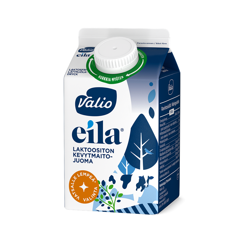 Valio Eila® laktoositon kevytmaitojuoma maistuu tavalliselta, raikkaalta maidolta ilman makeutta. Valio Eila® maitojuomat onkin valittu makutestin parhaiksi*. Nauti ruokajuomana tai käytä ruoanlaitossa ja leivonnassa! Kaikki Valio Eila® tuotteet sopivat laktoosittomaan ruokavalioon. Laktoosi on poistettu Valion patentoimalla teknologialla. *Laktoosittomien maitojuomien tuotetesti, Makery Oy (4/2018, n=243).