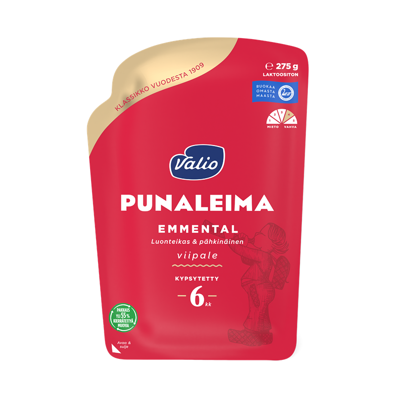 Valio Emmental punaleima juustoviipaleet ovat voimakasta ja aromaattista emmentaljuustoa kätevinä viipaleina. Juustomestarimme kypsyttävät Valio Emmental punaleimaa perinteisellä emmental-reseptillä aina vähintään 6 kuukautta. Maultaan se on voimakas ja pähkinäinen ja antaa täyteläistä makua esimerkiksi kuorrutuksiin, kastikkeisiin ja suolaiseen leivontaan. Saatavilla palana, viipaleina ja valmiina raasteena.