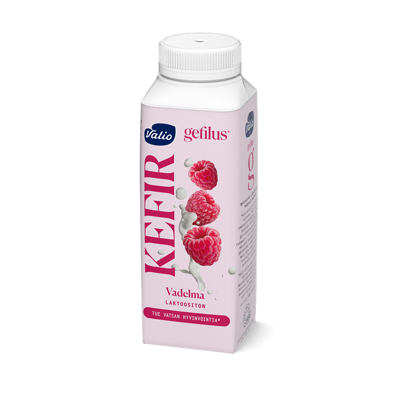 Tue vatsan hyvinvointia! Valio Gefilus® Kefir vadelma on herkullinen välipalajuoma, joka on helppo napata mukaan menoon. Juomassa on kefiirille ominainen raikas, kupliva ja pirskahtelevan pehmeä maku. Valio Gefilus® Kefir sisältää kalsiumia, joka edistää ruoansulatusentsyymien normaalia toimintaa. Tuote sisältää myös sinkkiä sekä C-, D- ja B12-vitamiineja, jotka edistävät luontaisen puolustusjärjestelmän normaalia toimintaa. Nauti osana tasapainoista ja monipuolista ruokavaliota ja terveitä elämäntapoja. Mukana myös LGG® maitohappobakteeri.