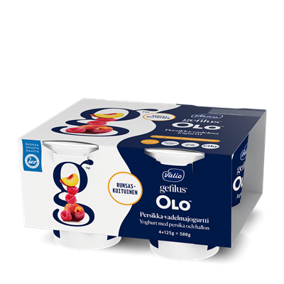 Valio Gefilus® OLO™ jogurtit nautinnolliseen oloon! Valio Gefilus® OLO jogurtit houkuttelevat hemmottelemaan vatsaa helposti ja herkullisesti aamuin illoin, osana tasapainoista ja monipuolista ruokavaliota sekä terveitä elämäntapoja. Ne sisältävät kalsiumia, joka edistää ruoansulatusentsyymien normaalia toimintaa. Entistä raikkaamman makuiset Valio Gefilus® OLO™ jogurtit sisältävät myös maailman tutkituinta LGG® maitohappobakteeria, BB-12® bifidobakteeria, D-vitamiinia ja runsaasti kuitua.