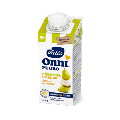Valio Onni® vadelma-mustikkapuuro on maidoton puuro, joka sopii lapsen ruokavalioon 5 kk iästä alkaen maisteluannoksina. Puuron valmistuksessa käytetään kotimaista täysjyväviljaa. Lempeän marjaisa ja miellyttävän pehmeä puuro on UHT-käsitelty ja säilyy avaamattomana huoneenlämmössä. Se onkin kätevä matkaeväs. Korkillisesta pakkauksesta puuroa on helppo annostella vaikka suoraan lusikkaan. Tarjoa sellaisenaan huoneenlämpöisenä tai lautasella lämmitettynä.