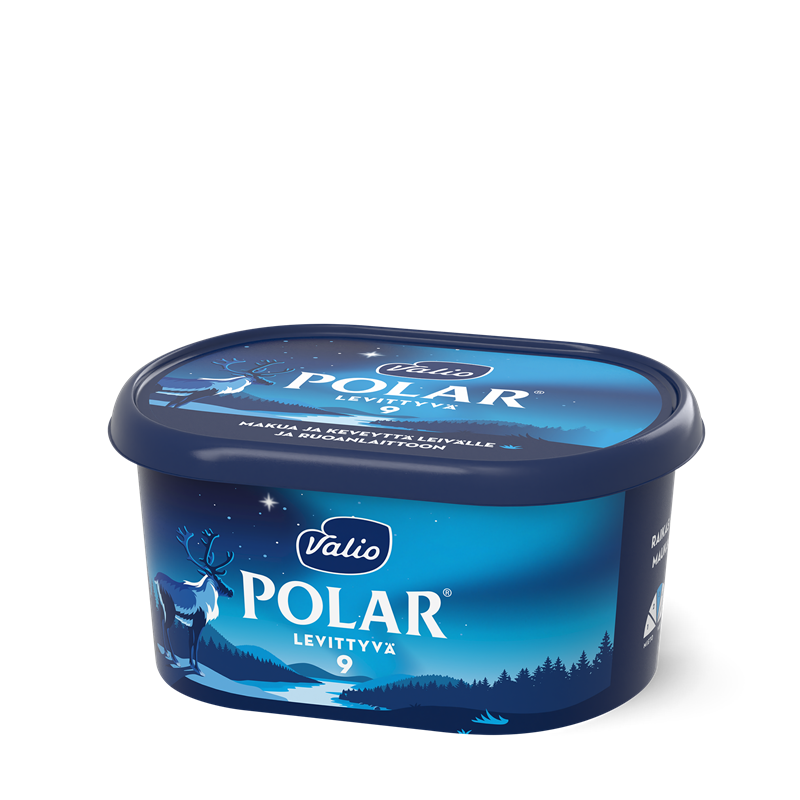 Valio Polar® 9 % sulatejuusto on kevyt ja miellyttävästi levittyvä, voimakkaan ja raikkaan makuinen sulatejuusto. Se on kevyempi valinta leivän päälle ja sulaa kauniisti myös keittoihin ja kastikkeisiin. Valio Polar® 9 % sulatejuustossa on rasvaa vain 9 %, mutta se tuo silti miellyttävää täyteläisyyttä esimerkiksi kastikkeisiin ja täytteisiin.