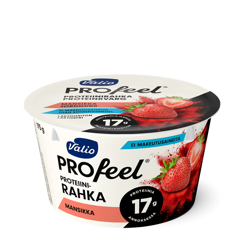 Ruoki tavoitteitasi proteiinilla! Valio PROfeel® proteiinirahka mansikka on pehmeä ja mansikkainen välipala. Nauti rasvaton ja laktoositon proteiinirahka vaikkapa töissä välipalana tai treenien jälkeen. Yhdessä pakkauksessa on 17 g laadukasta maitoproteiinia, joka sisältää kaikki elimistön tarvitsemat yhdeksän välttämätöntä aminohappoa samassa paketissa. Kokeile myös muita herkullisia makuja!