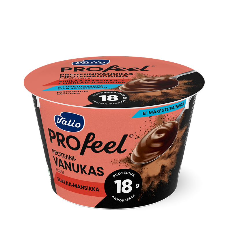 Treenipäivä, vanukaspäivä - nyt ilman makeutusaineita! Valio PROfeel® suklaa-mansikka proteiinivanukas sopii treenipäiviin ja hetkiin, jolloin haluat nautiskella terveellisemmin. Pehmeää täyteläisyyttä, runsaasti proteiinia ja herkullista makua ilman keinotekoisia makeutusaineita. Makeus sokerista (tuotteessa hiilihydraatteja 8,9 g/ 100 g) ja runsaasti laadukasta maitoproteiinia (18 g/purkki).