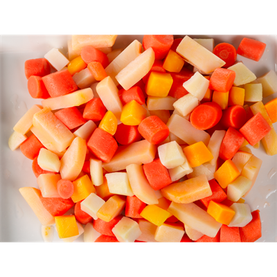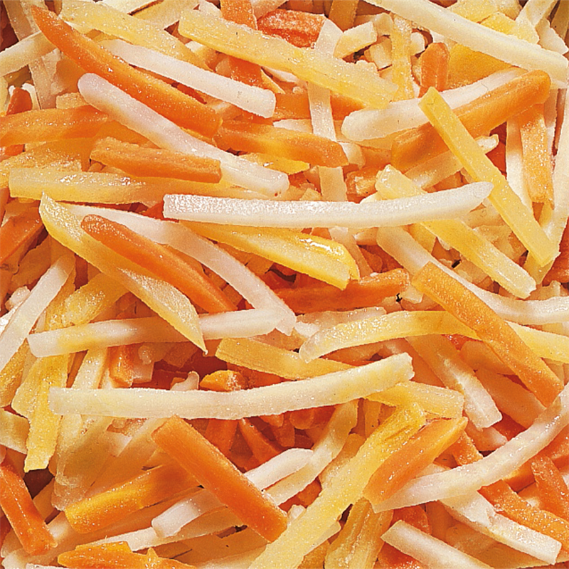 Kaikki kasvikset on ryöpätty. Porkkana-, palsternakka- ja sellerisuikaleet 4x6x65 mm.