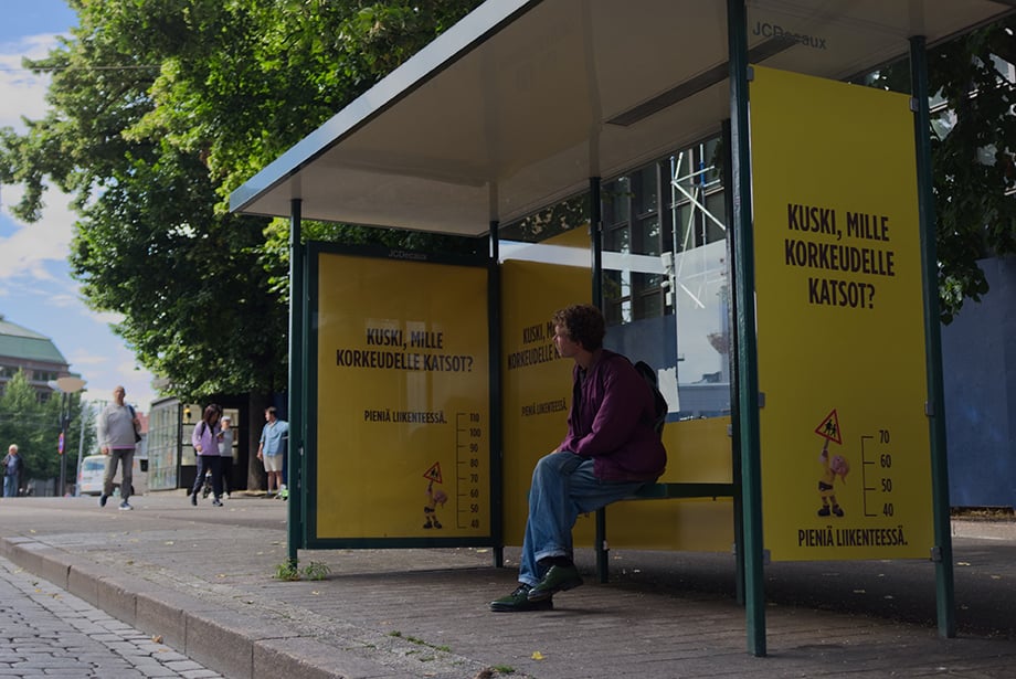 “Teippaamme keltaiseksi alakouluikäisen lapsen kokoa mittataulukon voimin havainnollistavan alueen bussien perissä ja pysäkeissä. Herra Oltermannin keltainen huomioalue erottuu ruuhkaisen liikenteen keskellä ja näyttää konkreettisesti vaadittavan turvavälin. Viemme viestin juuri sinne, missä elintärkeitä päätöksiä auton ratissa tehdään: liikenteeseen”, Wahlström kertoo.