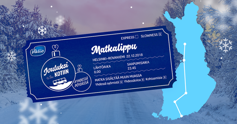 Jouluna kaikkien pitäisi päästä kotiin rakkaiden luokse ja yhteiseen pöytään. Valion joulubussi kulkee lauantaina 22.12. Helsingistä Rovaniemelle ja etsii nyt matkaansa nuoria aikuisia, jotka asuvat kaukana kotoa esimerkiksi opintojen takia. Linja-auto vie porukan perille, mutta yhtä olennaista on leppoisa matkanteko ja kiireetön, jouluinen yhdessäolo. Siksi express-bussivuoro vaihtuu slowness-linjaksi: matkan varrella pysähdytään syömään yhdessä ja poimitaan kyytiin uusia matkustajia. Bussissa tunnelmaa luo Radio Suomipopilta tuttu Tinni Wikström.