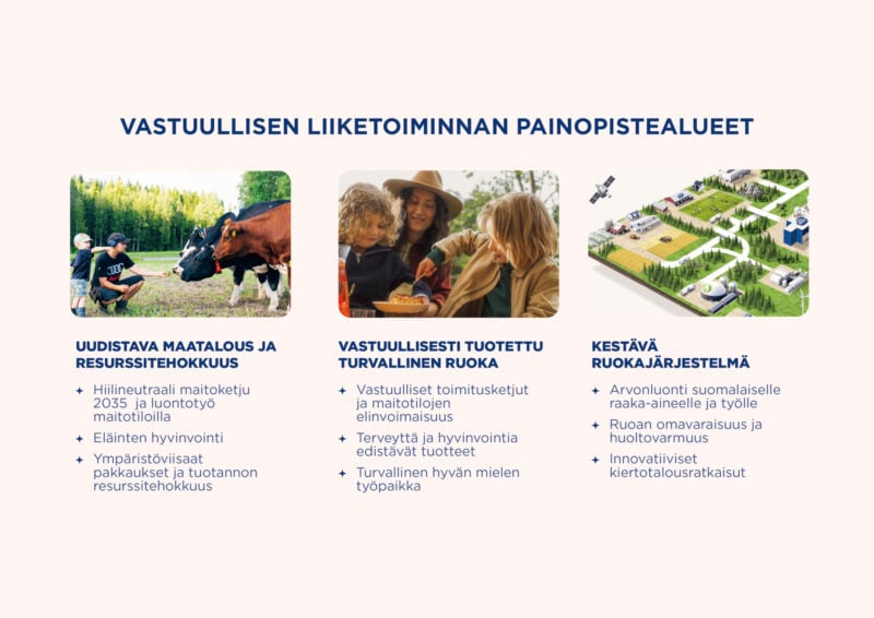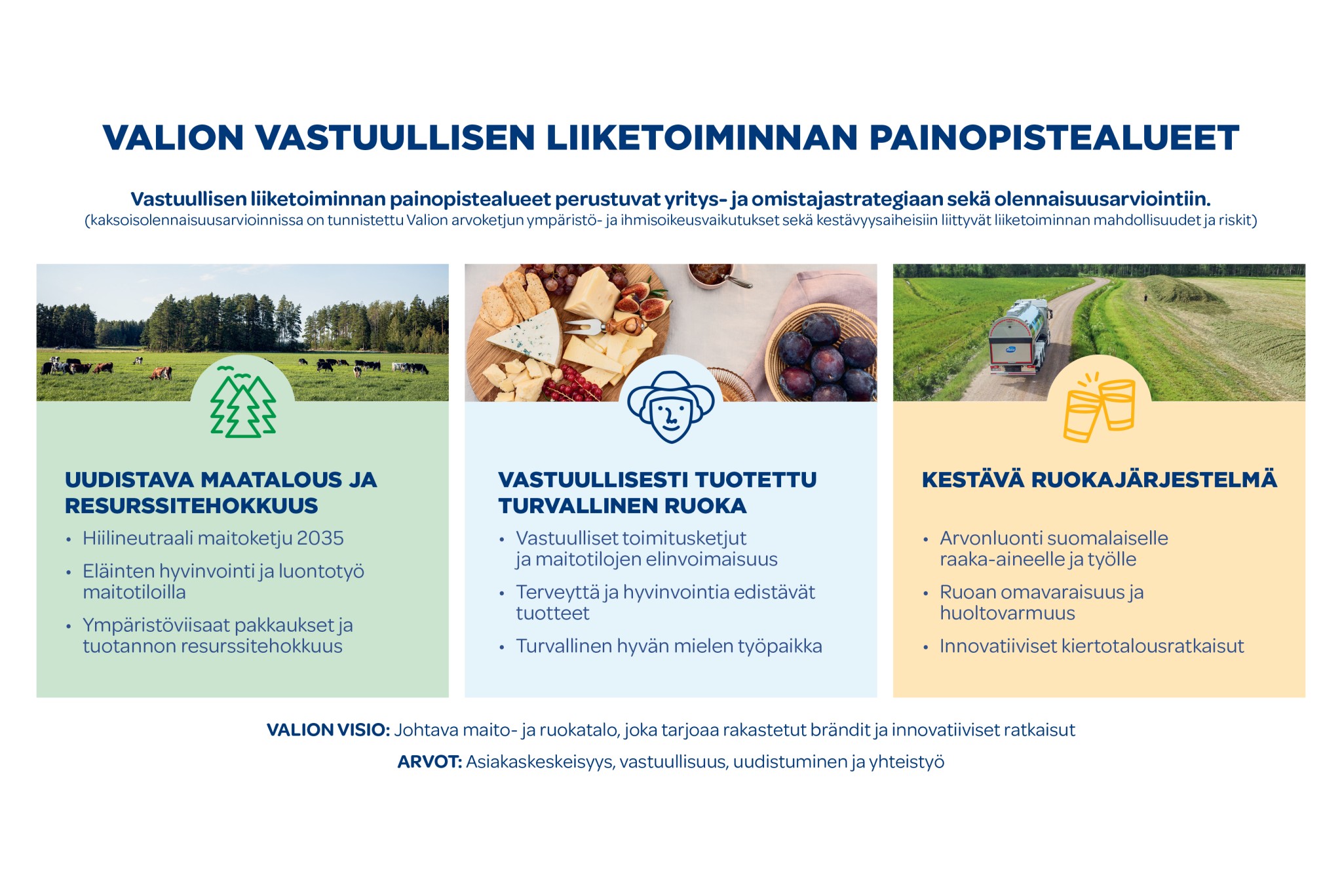 Valio-konsernin vastuullisen liiketoiminnan painopistealueet perustuvat sen liiketoiminta- ja omistajastrategiaan sekä olennaisuusarviointiin. Vastuullisen liiketoiminnan painopistealueet määrittävät asiat, joihin Valion vastuullisuustyö ja -tavoitteet keskittyvät. Olemme asettaneet kullekin painopistealueelle tavoitteet, seuraamme niitä säännöllisesti ja julkaisemme tietoa niiden etenemisestä vastuullisuusraportissamme.