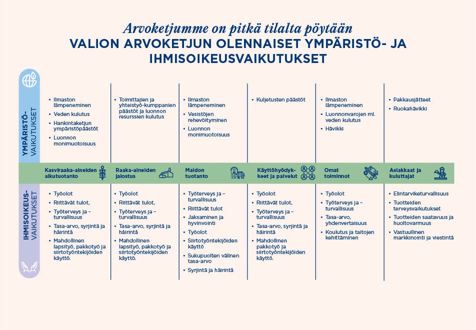 Valion arvoketjussa on monta vaihetta, jotka vaikuttavat ihmisten, ympäristön ja eläinten hyvinvointiin. Valion vastuullisuustyö pohjautuu arvoketjussa tunnistettuihin, Valiolle olennaisiin aiheisiin.