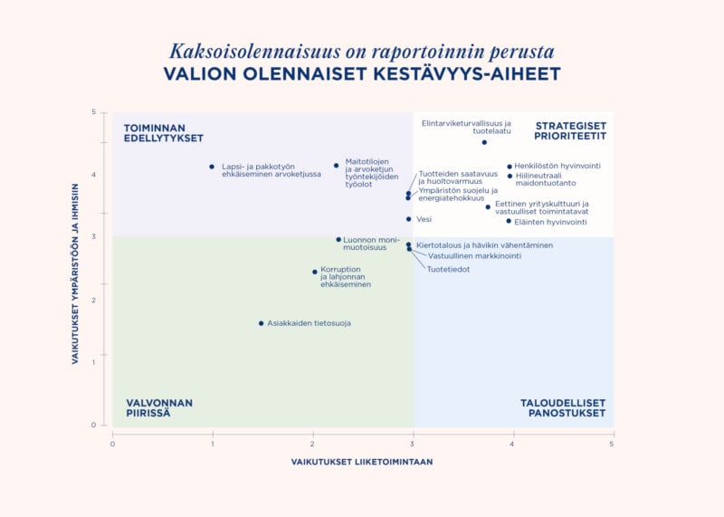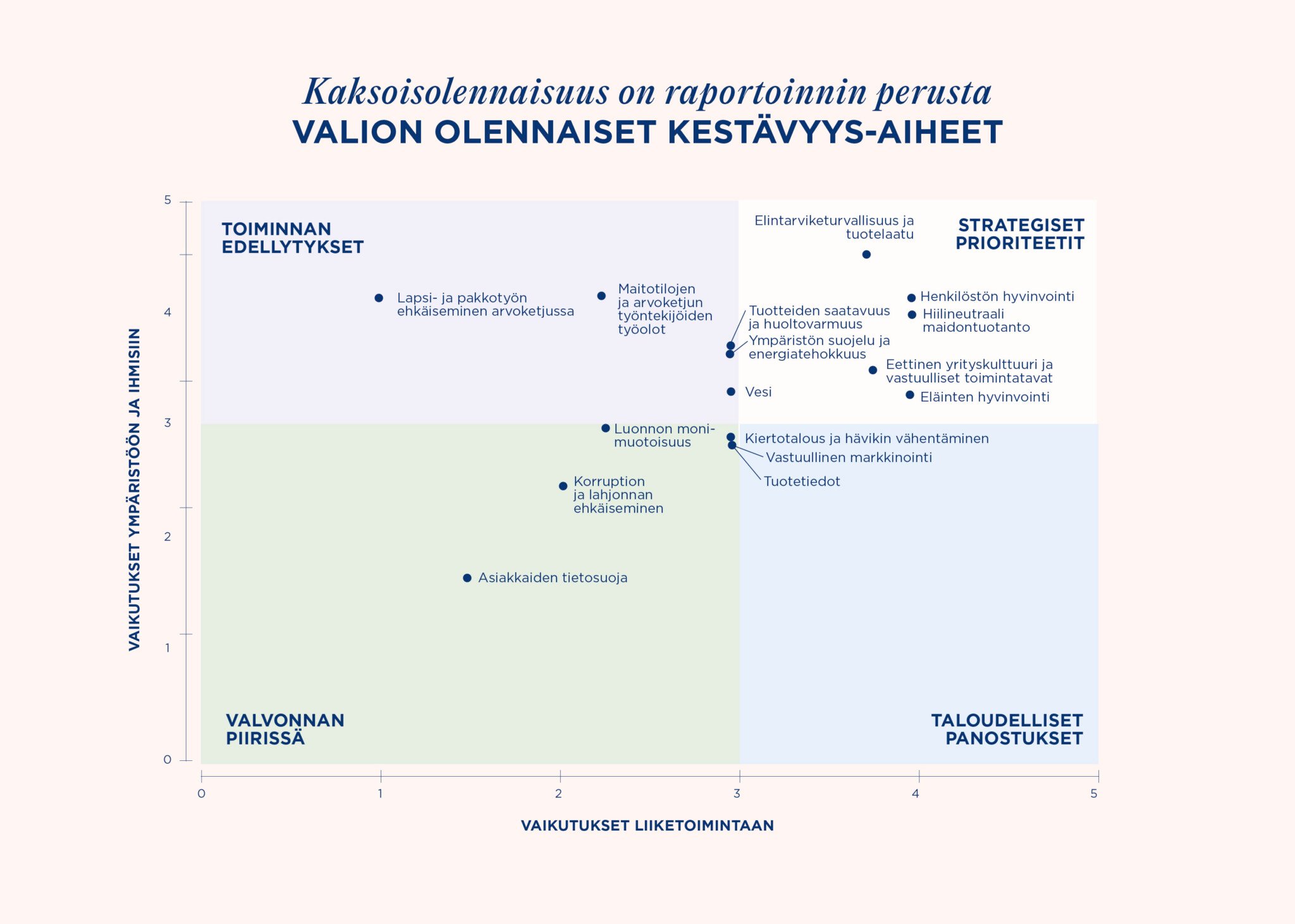 Olemme kartoittaneet toimintamme tärkeimpiä vastuullisuusaiheita yhdessä sidosryhmien ja asiantuntijoiden kanssa. Kaksoisolennaisuusarvioinnin tulos määrittää Valiolle olennaiset kestävyyden teemat yhtiön omien ihmisoikeus- ja ympäristövaikutusten sekä yhtiöön kohdistuvien kestävyyteen liittyvien taloudellisten vaikutusten näkökulmasta. Olennaisimmat teemat on koottu matriisiin, joka on Valion johdon vahvistama.